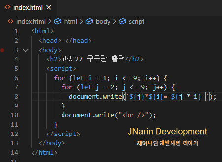 코드를 보시면 알 수 있듯이 for문의 숫자와 출력하는 document.write() 이 부분의 약간만 변경하는 것을 확인할 수 있다.